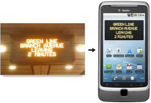 Riders of the DC metro are familiar with the signs in each station telling when to expect the next train. These signs are no doubt helpful, but tragically constrained to their fixed physical locations. What if we could view these signs on the desktop of our mobile device, saving us the step of clicking down through an app or website? In this post, I design a theoretical Android widget that imagines what this experience might be like.