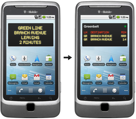 Putting this idea into form, I first created a very literal translation of the sign that greets me when arriving at the Greenbelt metro. I designed this as an Android widget, taking up a reasonable four columns by two rows of desktop space.